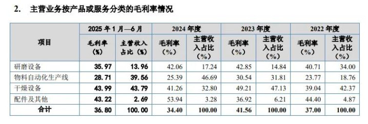 主营业务毛利率波动大。龙鑫智能收入来源于干燥设备、物料自动化生产线、研磨设备、配件及其他,2025年上半年的收入分别为1.48亿元、1.34亿元、4,729.52万元、911.01万元,收入占比分别为43.79%、39.56%、13.96%、2.69%。拉长时间线来看,核心产品收入贡献存在较大波动,例如研磨设备占比在达到34%后开始下滑,研磨设备物料自动化生产线占比从18.76%一路上升。