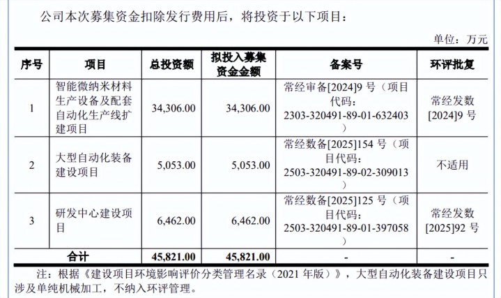 据短平快解读了解,本次IPO,龙鑫智能拟向不特定合格投资者公开发行股票不超过2246万股,拟募集资金4.58亿元,用于智能微纳米材料生产设备及配套自动化生产线扩建项目(生产线扩建项目)、大型自动化装备建设项目以及研发中心建设项目,拟投入募集资金分别为3.43亿元、0.51亿元、0.65亿元。