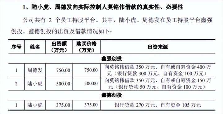 莫铭伟借钱给高管超700万元。龙鑫智能两大员工持股平台鑫强创投、鑫德创投均成立于2022年9月,部分员工部分认购款来源于向实际控制人莫铭伟、莫龙兴借款,具体来看,周德发、陆小虎、顾泓午分别向莫铭伟借款350万元、350万元、5万元,何洪吉、王锋兵向莫龙兴借款金额均为5万元。