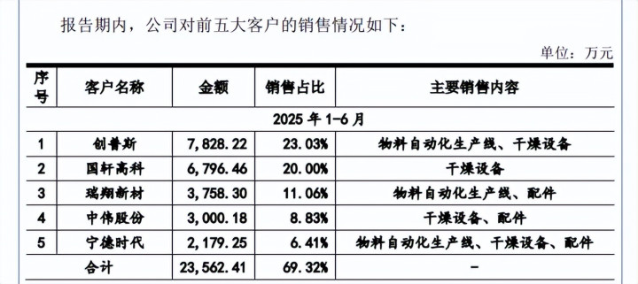 公司期末前五客户包括创普斯、国轩高科、瑞翔新材、中伟股份、宁德时代,前三大客户收入分别为7,828.22万元、6,796.46万元、3,758.30万元,占比分别为23.03%、20%、11.06%,销售内容物料自动化生产线、干燥设备、配件等。