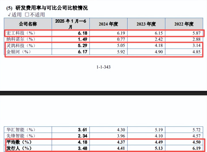 对比行业,可比同行研发费用率均值分别为4.5%、4.49%、4.37%、4.18%,期末超过公司,进一步来看,2024年,宏工科技、灵鸽科技、金银河研发费用率分别为6.19%、5.05%、5.92%,均远超公司,显然还要进一步增强研发投入。